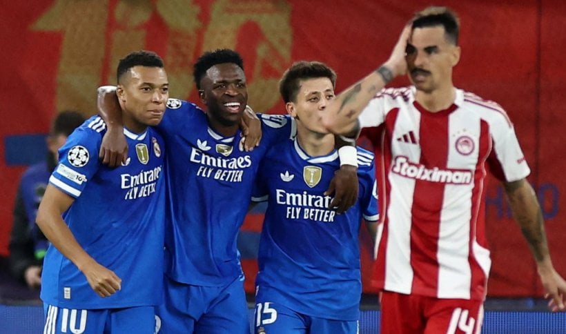 وافتتح أصحاب الأرض أولمبياكوس النتيجة مبكراً عن طريق شيكينهو ليما في الدقيقة 9، ثم سجل كيليان مبابي هدف التعادل لصالح ريال مدريد من صناعة فينيسيوس في الدقيقة 22.