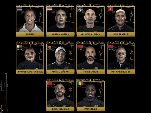 La lista incluye diez nombres destacados, entre ellos el egipcio Hossam Hassan, entrenador de la selección de Egipto, y el marroquí Walid Regragui, entrenador de la selección de Marruecos. También se incluyen otros entrenadores de diferentes países africanos, encabezados por Bubista, entrenador de la selección de Cabo Verde, y Krunoslav Jurčić, entrenador del club Pyramids, así como Sami Trabelsi, entrenador de la selección de Túnez, y Moein Chaabani, entrenador del Renaissance Berkane de Marruecos.